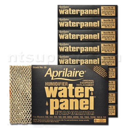 Aprilaire #35 Humidifier Water Panel - (10-Pack) The "heart" of your whole-house humidifier, the Water Panel (also known as humidifier filter, water pad, evaporator pad), should be changed at least once per heating season. The pad is constructed of an expanded aluminum honeycomb mesh that is dipped in a clay coating. This coating is able to absorb and hold water. Warm, dry air is forced through the wet pad to introduce water vapor into the home. Product Features: Factory original OEM part Dimensions approximately - 10" x 13" x 1-1/2" Pad change instructions are printed on product carton Fits the Following Humidifiers: Aprilaire 350 Aprilaire 360 Aprilaire 560 Aprilaire 560A Aprilaire 568 Aprilaire 600 Aprilaire 700 Aprilaire 760 Aprilaire 760A Aprilaire 768 Humidifier water panels (sometimes referred to as a filter) are a regular replacement item in whole-house humidifiers. For the best performance we recommend that the Water Panel be replaced once a year, either prior to the start or at the end of the heating season. If you have especially hard water - the panel can be replaced 2 times per year. Click here for instructions on chang